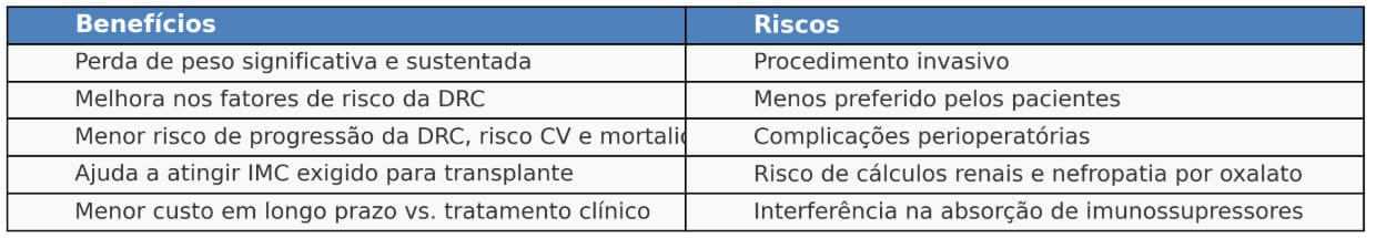* Bypass gástrico em Y de Roux (BGYR): reservado para casos de obesidade grave ou DM2 refratário, porém possui risco potencial de nefropatia por oxalato e cálculos renais.