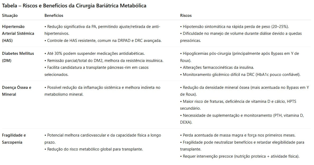 A cirurgia bariátrica metabólica é uma ponte estratégica para viabilizar o transplante renal em pacientes obesos, com potencial de reduzir complicações e melhorar a sobrevida. A decisão deve ser individualizada, guiada por equipe multidisciplinar e com seguimento rigoroso.