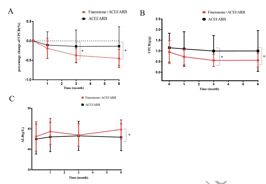 A combinação finerenona + IECA/BRA reduziu significativamente a P/C ao final de 6 meses, enquanto o grupo controle apresentou redução discreta (**Figura abaixo**) .