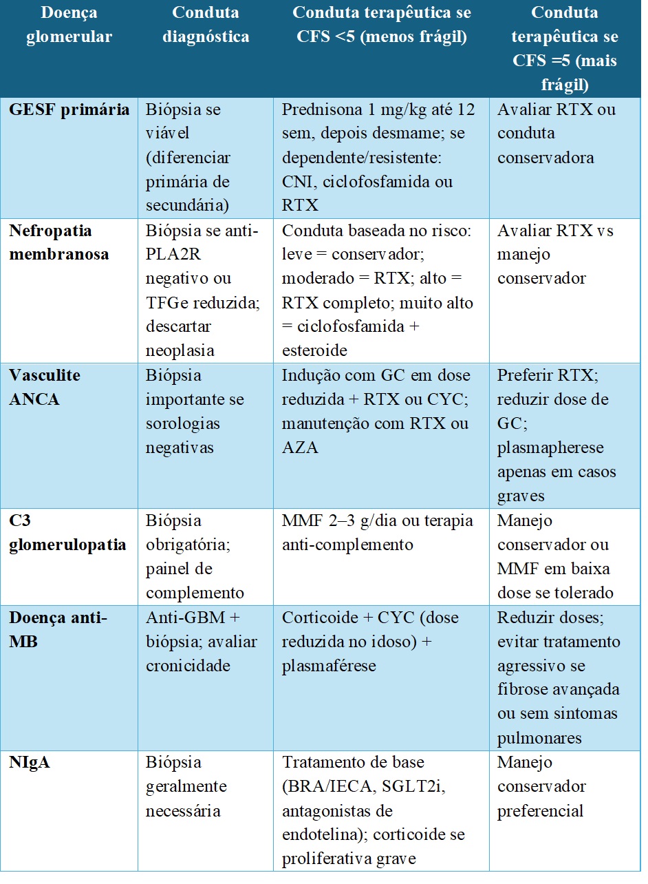 **Referência**: Wiegley N, Jhaveri KD, Corona A, So P, Jain K. How I treat glomerular diseases in older adults. CJASN. 2025. \[**[link](https://pubmed.ncbi.nlm.nih.gov/40587222/)**]