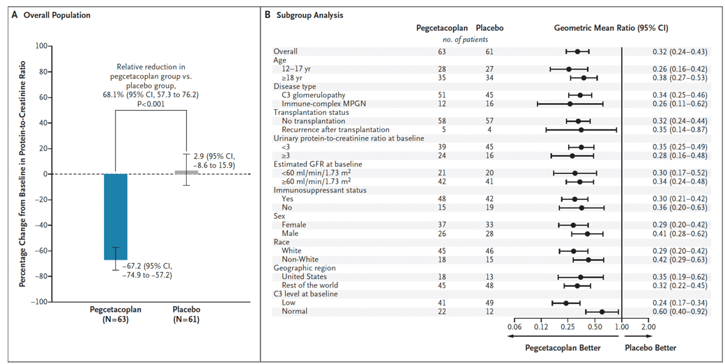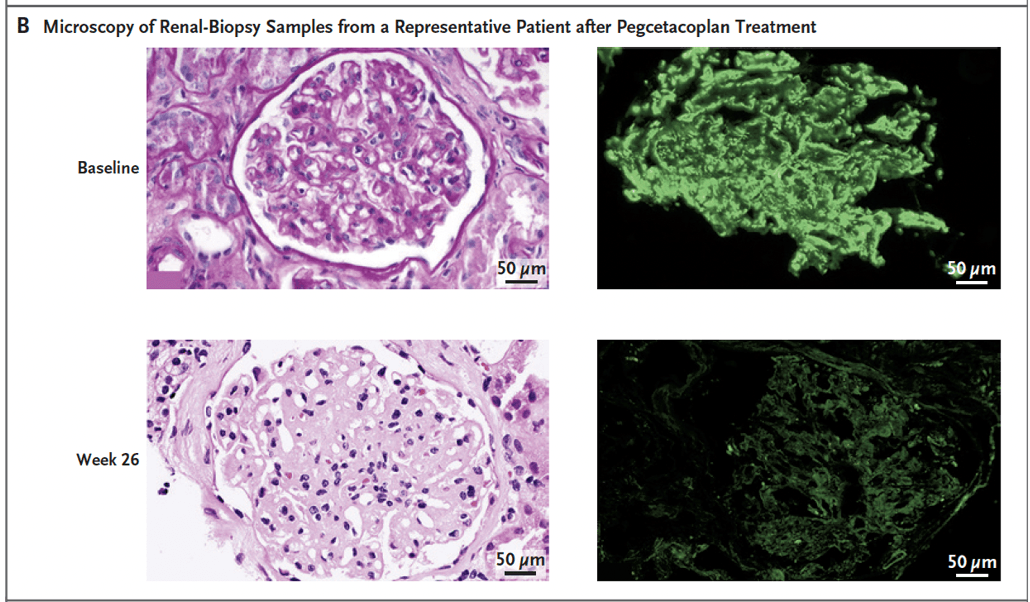 **Referência**: Fakhouri F, Bomback AS, Ariceta G, et al. Trial of Pegcetacoplan in C3 Glomerulopathy and Immune-Complex MPGN. NEJM, 2025 \[**[link](https://www.nejm.org/doi/full/10.1056/NEJMoa2501510?query=featured_nephrology)**]