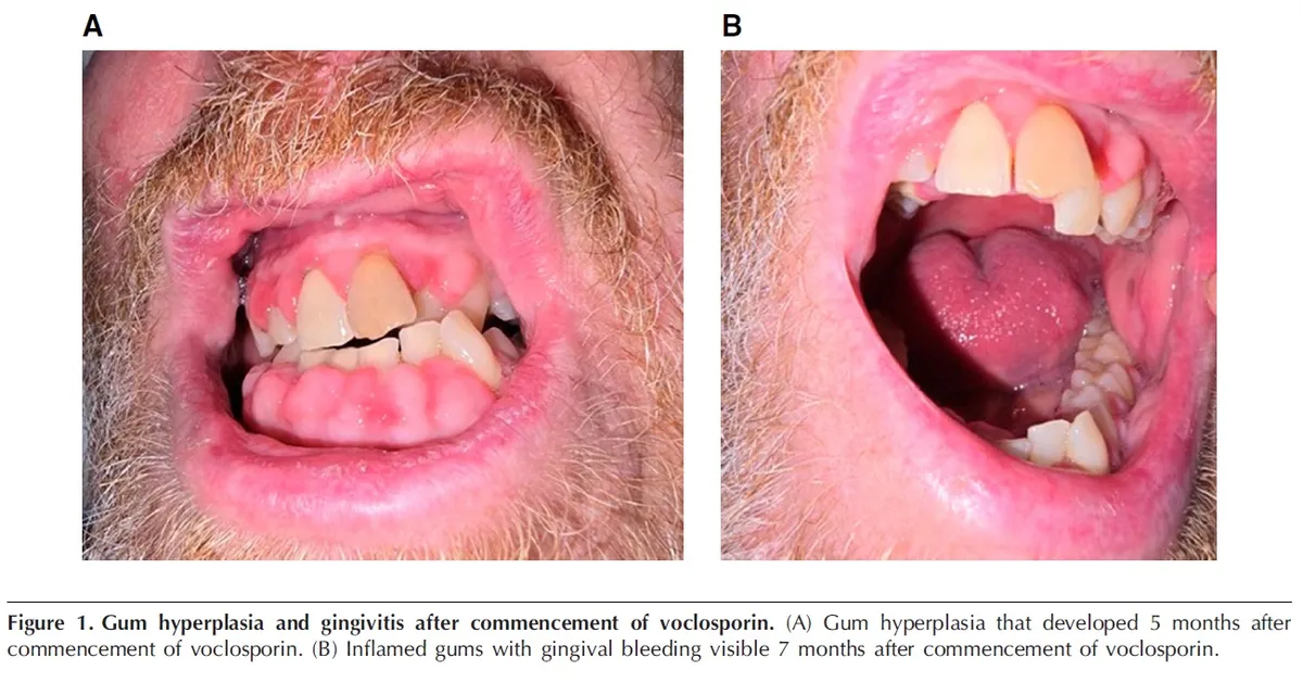 Até então, não havia relatos prévios de hiperplasia gengival induzida pela voclosporina.** Mas a ciclosporina causa!** A hiperplasia gengival é um efeito adverso conhecido da ciclosporina, com prevalência entre 25% e 80%.