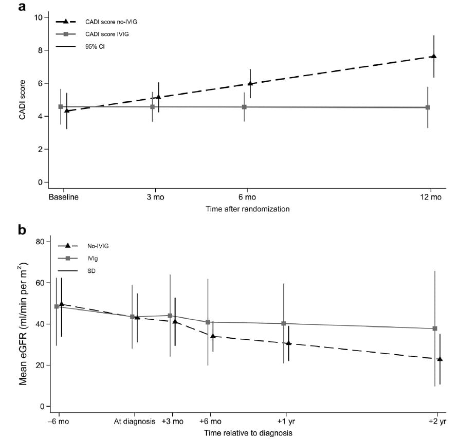 * Histologia: **CADI estável **com IVIG (–0,004/mês) vs. **piora **no grupo controle (+0,28/mês).