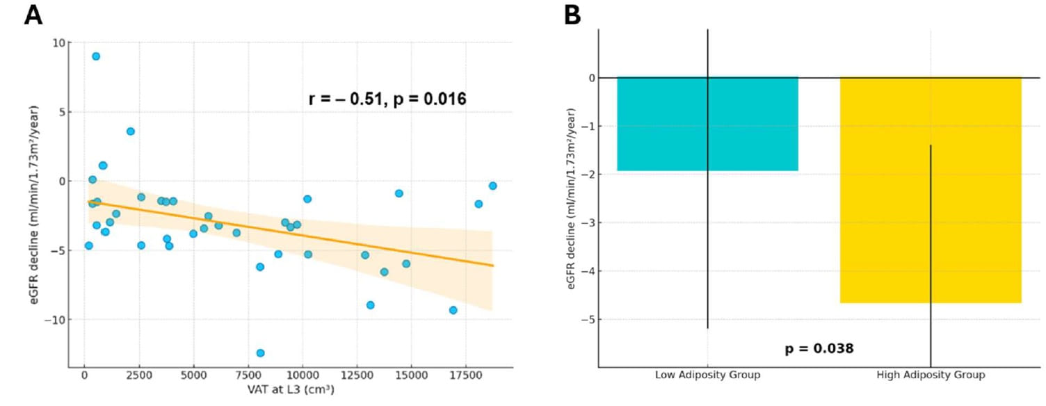 Esse estudo foi uma Coorte com 39 pacientes DRPAD, TFGe basal\~70 ml/min/1,73m², seguimento médio 31 meses. O VAT foi medido por RM (segmentação automatizada).