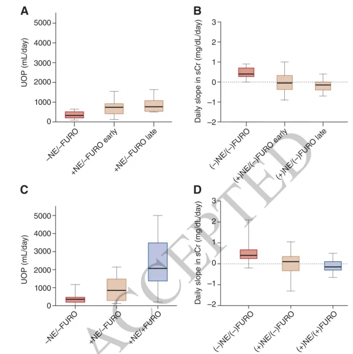 **Efeitos da adição de um diurético de alça à norepinefrina durante o tratamento do SHR-IRA (SHR-1). **Em um estudo observacional com 26 pacientes com SHR-IRA, todos com creatinina sérica (Cr) mediana pré-tratamento de 4,0 mg/dL e com sobrecarga volêmica tratados com norepinefrina (NE) concomitante e furosemida (FURO), o início da NE isoladamente por uma mediana de 1–2 dias produziu um aumento mediano da pressão arterial média (PAM) de 16 mmHg, o que, por si só, elevou o débito urinário diário (DU) de uma mediana basal de 358 mL para uma mediana de 850 mL (A). A adição subsequente de FURO (dose mediana de 160 mg IV duas vezes ao dia por dois dias) aumentou ainda mais o DU diário para uma mediana de 2072 mL (C). A inclinação diária mediana da Cr antes do tratamento era de +0,4 mg/dL/dia, que diminuiu para uma inclinação mediana de +0,05 mg/dL/dia após o início da NE isoladamente (B). Com a adição de FURO, a inclinação da Cr permaneceu melhorada, com tendência a melhora adicional, atingindo mediana de –0,16 mg/dL/dia (sem diferença estatisticamente significativa em relação ao período pós-NE/pré-FURO) (D).* p < 0,001 comparado ao basal. ** p < 0,0001 comparado ao basal.